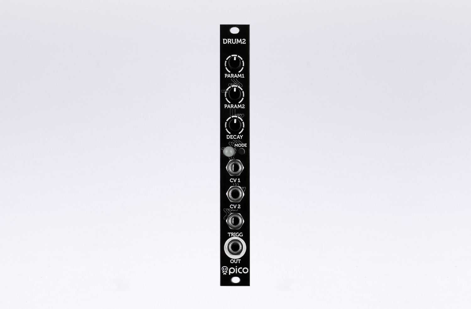 Pico Drum 2 features 8 drum synthesis algorithms created to deliver distinct sounds to your modular system. Each algorithm offers plenty of flexibility, whether you are looking for a big sounding bass drum or a squelchy snare. Each can be dialed in within the same algorithm. Pico Drum 2 also tracks 1V/Oct and all parameters can be mapped to the CV1 input.