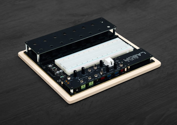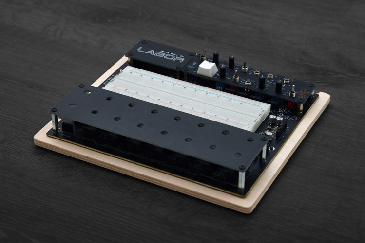 EDU DIY Labor is available in two variations. The Basic Kit (priced at €170) includes the LABOR, PSU, jumper cables and an array of interfacing elements like potentiometers, jack sockets, switches. The Full Kit (priced at €195.00) includes the Labor, PSU, jumper cables, an array of interfacing elements (like potentiometers, jack sockets, switches) and commonly used components (resistors, capacitors, chips, transistors) so users can start building circuits straight away.