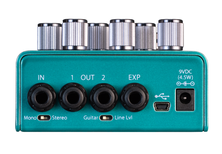 Three knobs for Drive, three for Vibe, and a pair of dual-action latching or momentary footswitches provide players effect control, with five onboard presets and more available using Eventide Device Manager (EDM) software. A triple Aux switch can be used for easy preset selection or a single Aux switch for Tap Tempo. Riptide’s Catch-up mode lets you dial in your sound when toggling between presets/parameters. The pedal offers multiple bypass options – Buffered, Relay, DSP+FX or Kill dry. It also provides MIDI support over USB.