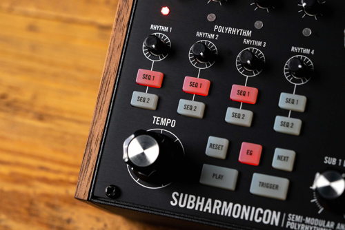 Subharmonicon is an intensely creative semi-modular analog polyrhythmic synthesizer that uses mathematical ratios to tune its four Subharmonic Oscillators and control the timing of its four Rhythm Generators. Because these tuning and timing values are integer-derived, there is something uniquely coherent about how patterns and phrases created using Subharmonicon blend together musically. As with Mother-32 and DFAM, Subharmonicon conforms to the 60HP Eurorack format; features aluminum rails, finished wood side pieces, and an extensive patchbay; and can perform as a standalone electronic instrument. Learn more here.