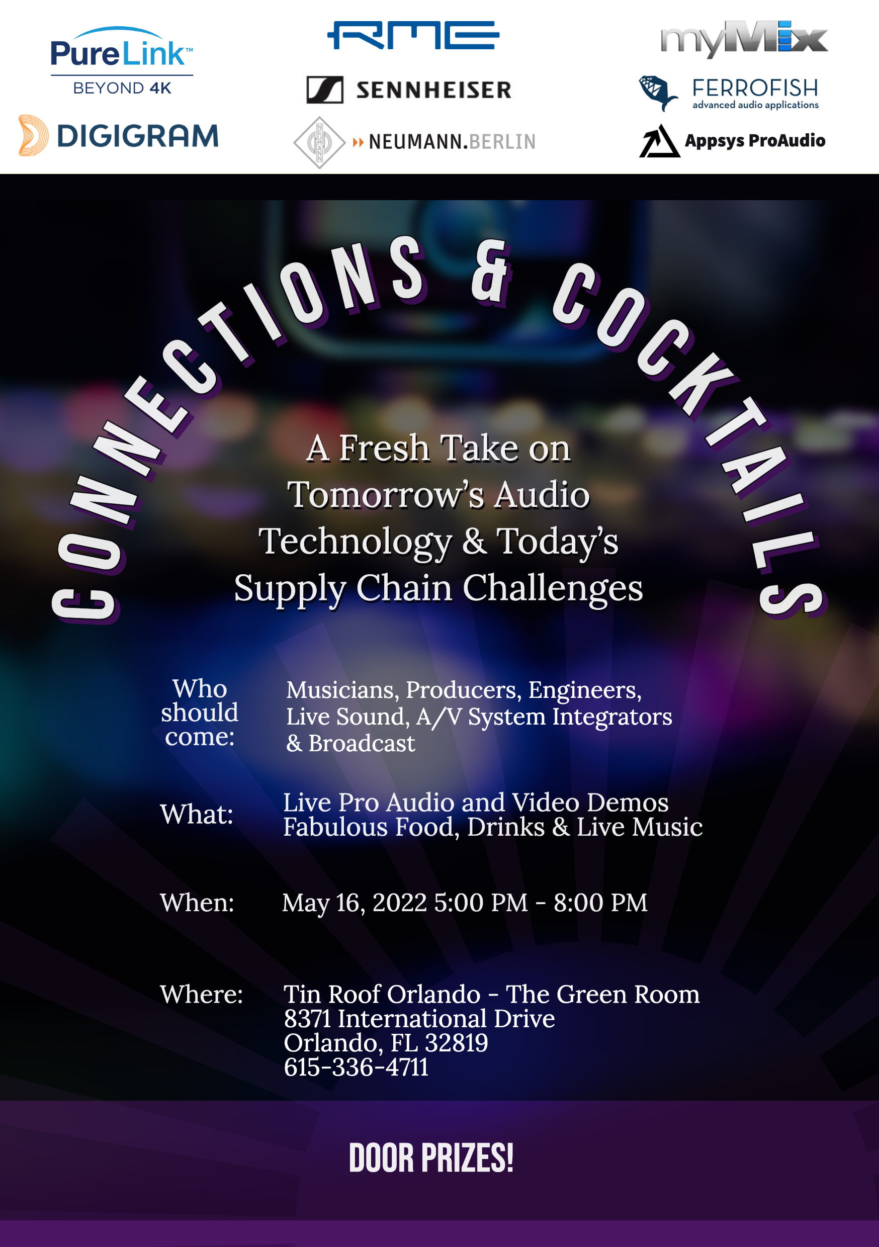Orlando, Florida, May 16, 2022— Synthax, U.S. distributor of RME, Ferrofish, Digigram, Appsys and myMix, will host a Connections & Cocktails event alongside sponsors Sennheiser, Neumann and PureLink on Monday, May 16th. The one-night event will be held in The Green Room inside the Tin Roof from 5-8pm. Mingle with industry professionals with food, an open bar, live music and live demos. All are free to attend.