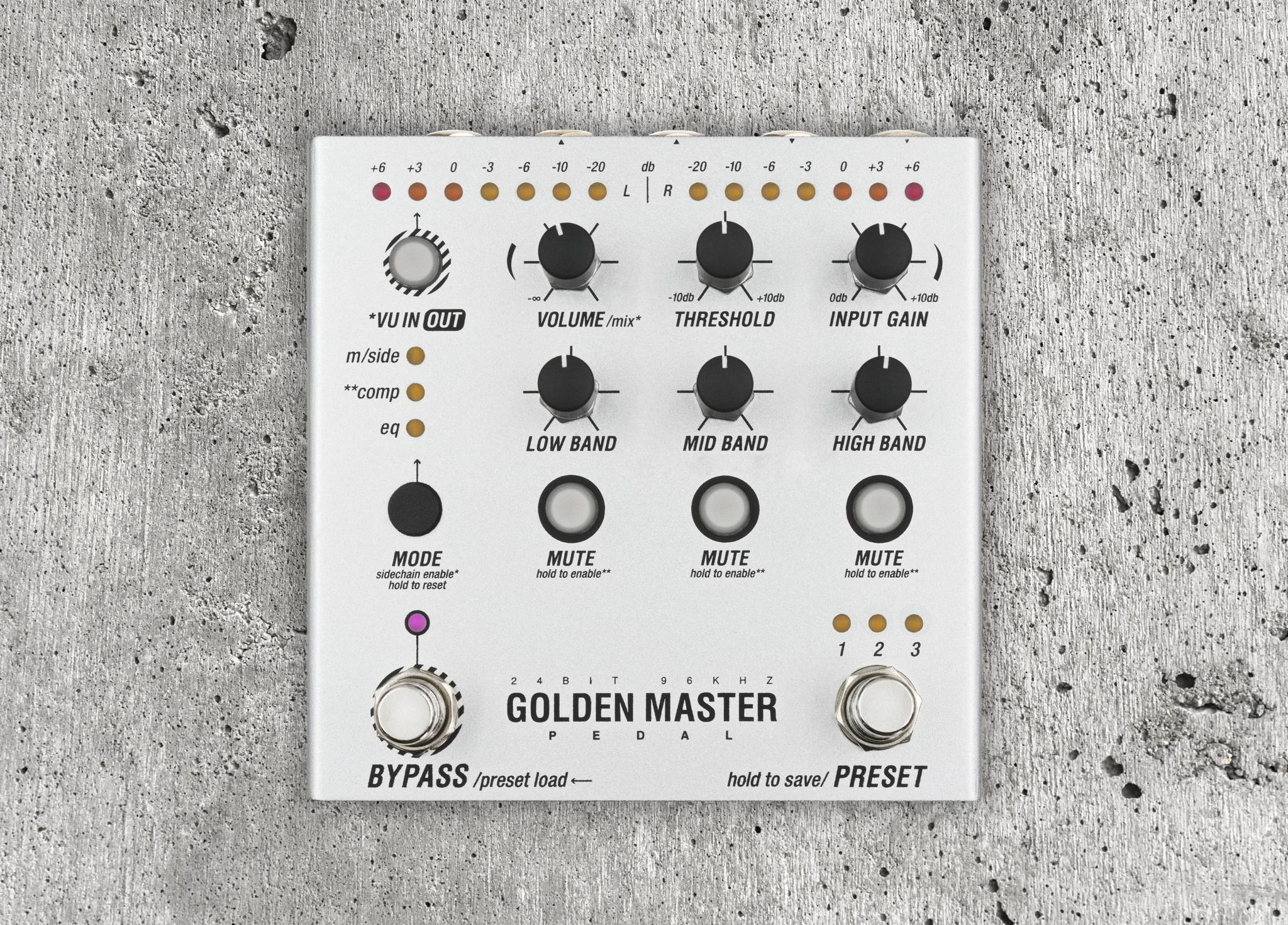 Crafted with the discerning needs of both live musicians and studio virtuosos in mind, the Golden Master Pedal stands as a testament to punch and power. At its core, the pedal boasts 32-bit internal processing, multi-band compression and EQ — delivering pristine audio that enriches stereo mixes and while also imparting life to individual elements.
