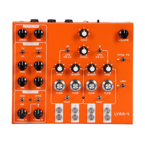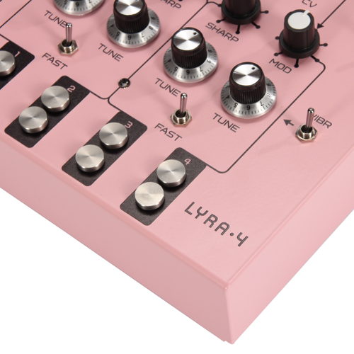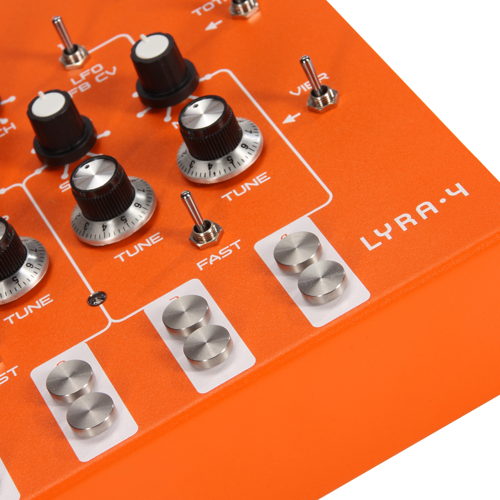 Sonically, LYRA-4 is based on four generators, which can also be referred to as voices. Instead of having a linear or logarithmic dependency on control voltage like a traditional subtractive synthesis VCO, LYRA-4's voices resemble the tone generators found in old electric organs, and each of the voices are constructed in such a way that allows for non-linearity to express itself.