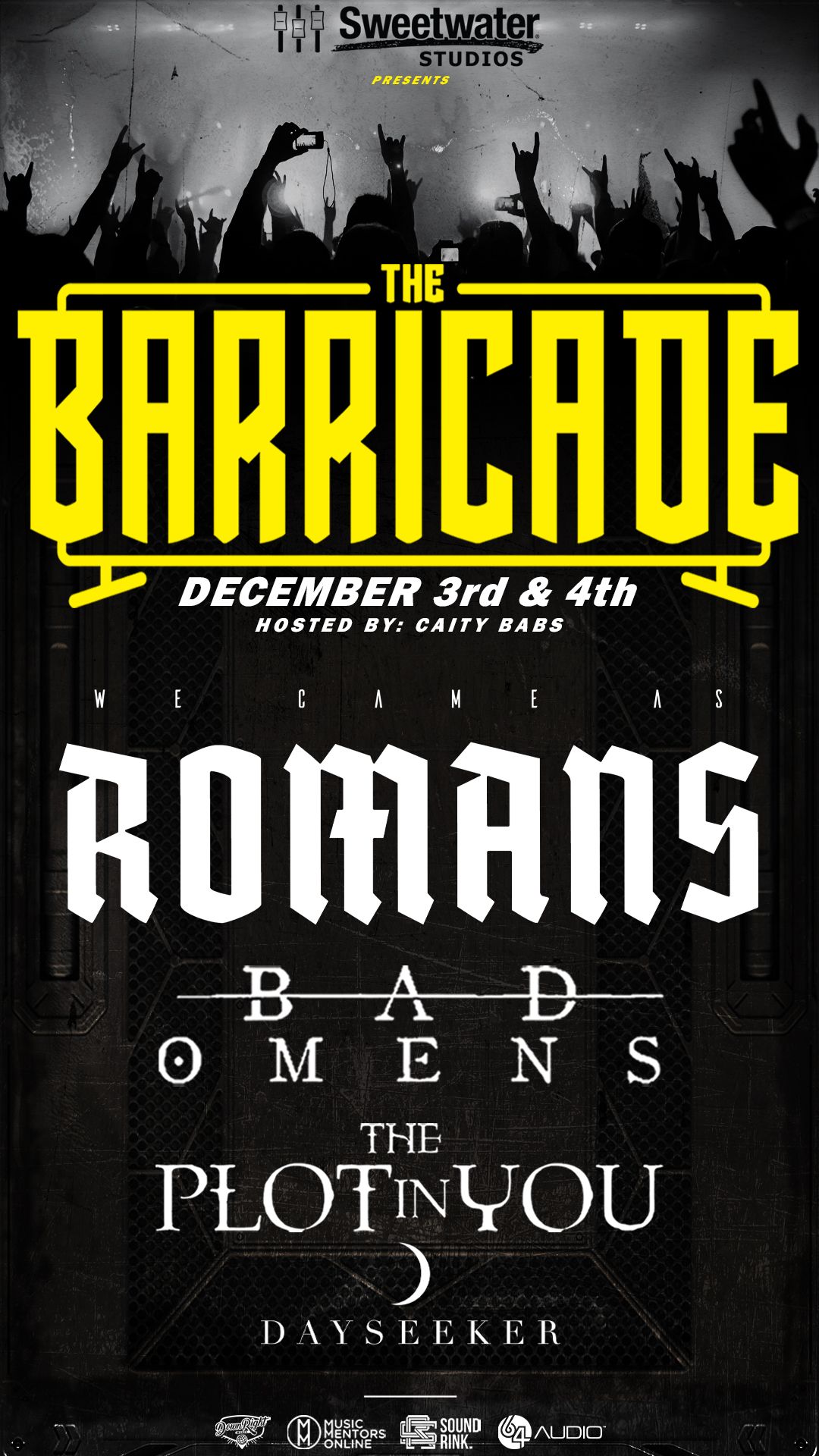 December 3, 2020, Fort Wayne, IN – Sweetwater Studios, the state-of-the-art recording studio arm of music retailer Sweetwater Sound, have announced ‘The Barricade’, a live performance event of heavy rock headlined by acclaimed metalcore band We Came as Romans. The event will take place over two days, the first featuring The Plot in You and Dayseeker on Thursday, December 3rd at 7pm ET and the second – which was filmed at Sweetwater Studios’ Performance Theatre -- featuring Bad Omens and We Came as Romans on Friday, December 4th at 7pm ET. The event is free and open to all.