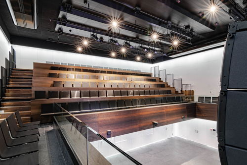 The balcony seating area was adapted for excellent sight lines, acoustic control, and minimal sound reflections. The edge of the balcony is finished at an angle to ensure the furnishings do not reflect sound back onto the stage. Instead, sound is reflected up towards the ceiling, which has been designed to supply maximum low-frequency absorption and minimise reflections back into the audience area. Perforated gypsum panels that provide low-mid frequency absorption were applied to the underside of the balcony, further reducing reflections. The result is highly intelligible sound transmission, even SPL coverage, and the absence of artefacts.