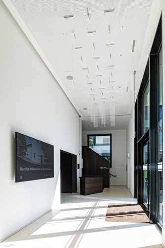 “It was a challenge to combine all requirements in the existing building. Due to proximity to the hospital, a room-in-room system was developed by WSDG, and the hall was completely decoupled from the existing shell,” Epple explains. “The building structure is worthy of protection, but this gave us a tight range of possibilities for the project. We developed a simple extension encompassing the new entrance, with foyer, staircase and elevator. All other functions are located in the existing building: the catering area, with a small kitchen and bar, is organised behind the hall.”