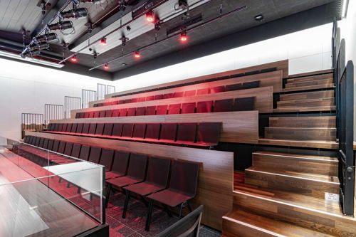 Dirk Noy, Partner, Director of Applied Science and Engineering at WSDG, and his team studied the existing acoustics of the main auditorium to discover any issues. Originally the central hall was highly reflective with sharp corners. By adding wall and ceiling treatments to these surfaces, WSDG was able to vastly reduce sound reflections, improving intelligibility for the space. A Helmholtz resonator was utilised in the ceiling to offer maximum low-frequency sound absorption.